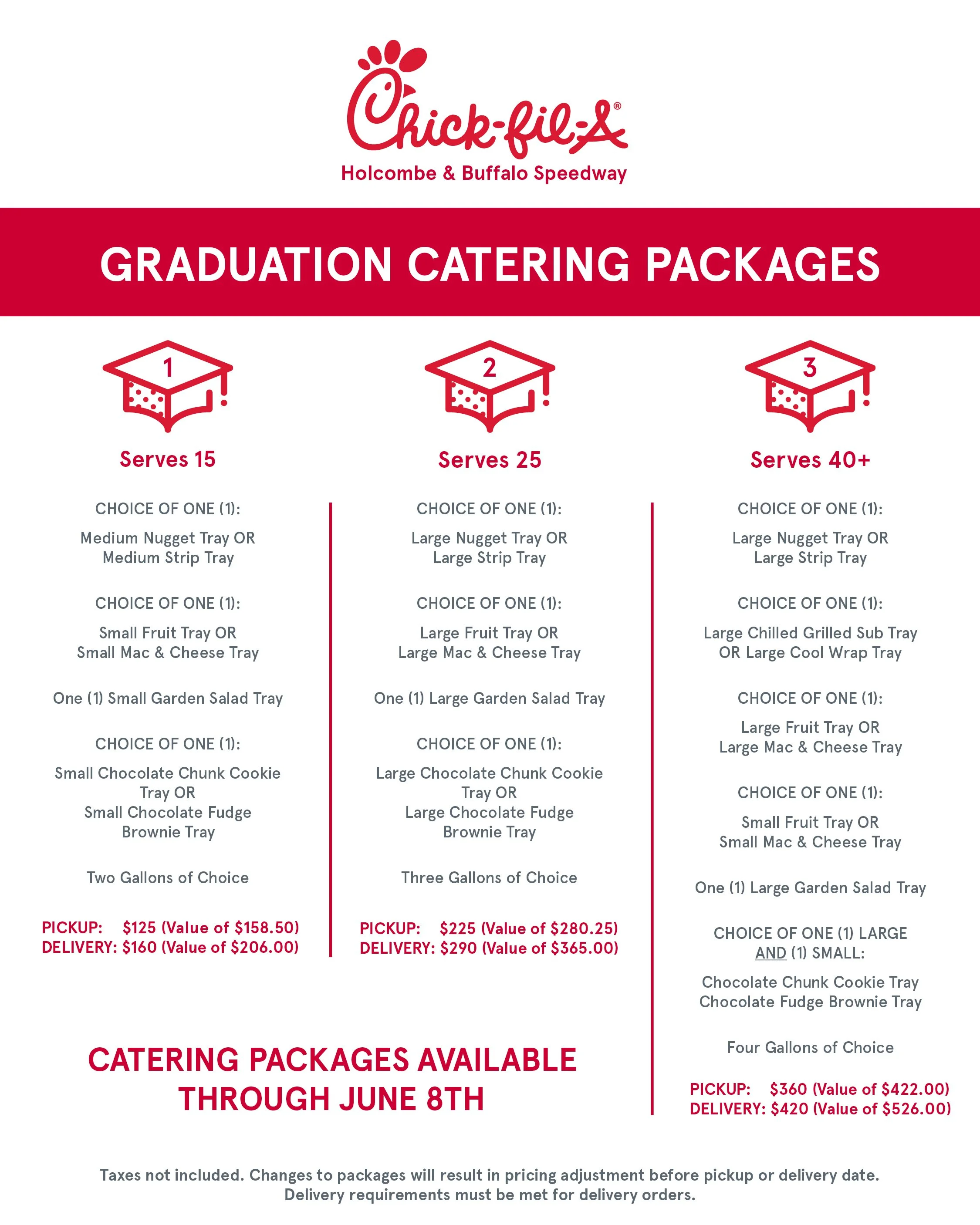 Hats off to Chick-fil-A Catering! Celebrate your graduate with one of our thoughtfully planned packages that makes entertaining easy so you can focus on what’s really important…the moment. Contact Us to Order Today! Email01376@chick-fil-a.com Phone(713) 660-8200